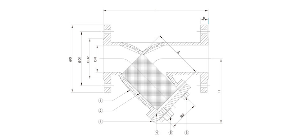 | 编号 | 零件名称 | 材质 | | 1 | 阀体 | WCB, CF8, CF8M | | 2 | 筛网 | SS304, SS316 | | 3 | 阀盖 | WCB, CF8, CF8M | | 4 | 阀盖垫圈 | 石墨 | | 5 | 塞子 | SS304, SS316 | | 6 | 螺栓 | SS304, SS316 |