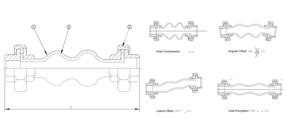 J12系列螺纹连接双球伸缩接头设计用于弥补管道中的各种位移,如热膨胀引起的位移,地形或建筑结构的沉降,扭曲位移和装配错误,机械振动,水锤等。