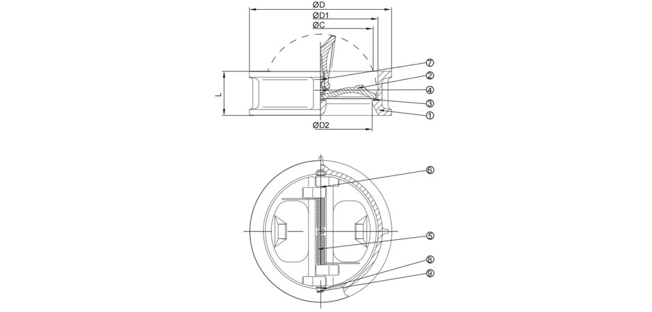 | 编号 | 零件名称 | 材质 | | 1 | 阀体 | WCB, CF8, CF8M | | 2 | 阀板 | CF8, CF8M | | 3 | 阀座 | Cr13, 硬合金 | | 4 | 阀轴 | SS304, SS316 | | 5 | 弹簧 | SS301, SS321 | | 6 | 轴承 | 金属阀座:SS316 | | 7 | 定位销 | SS304, SS316 | | 8 | 导向器 | SS304, SS316 | | 9 | 定位螺钉 | SS304, SS316 | | 10 | 吊环螺栓 | SS304, SS316 |