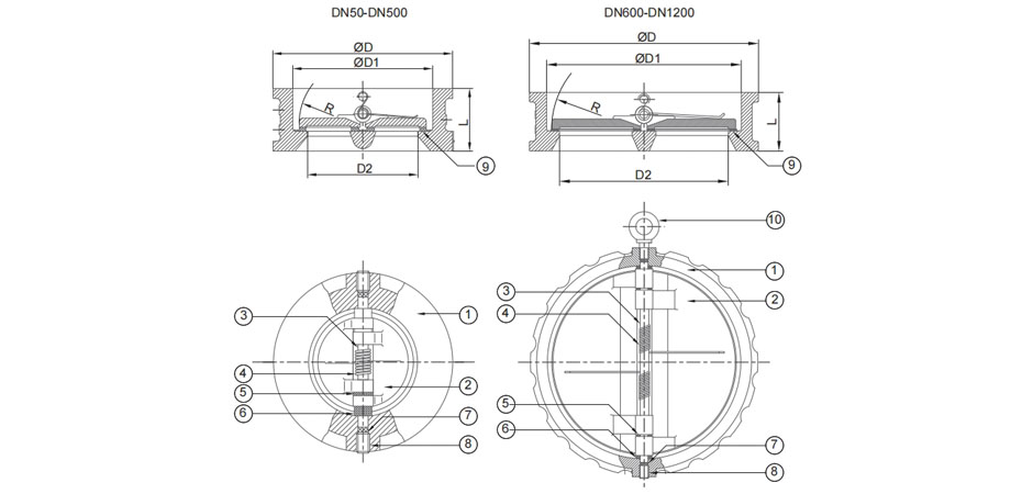 | 编号 | 零件名称 | 材质 | | 1 | 阀体 | WCB, CF8, CF8M | | 2 | 阀板 | CF8, CF8M | | 3 | 阀轴 | SS304, SS316 | | 4 | 弹簧 | SS301, SS321 | | 5 | 轴承 | 橡胶阀座:PTFE, 金属阀座:SS316 | | 6 | 轴承 | 橡胶阀座:PTFE, 金属阀座:SS316 | | 7 | O型密封圈 | 和橡胶阀座一样, 金属阀座:石墨 | | 8 | 六角螺栓 | SS304, SS316 | | 9 | 阀座 | NBR, EPDM, FPM, 金属阀座 | | 10 | 吊环螺栓 | SS304, SS316 |