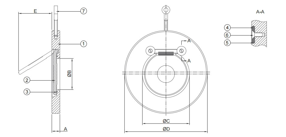 | 编号 | 零件名称 | 材质 | | 1 | 阀体 | 碳钢镀锌,SS316L | | 2 | 阀板 | CF8,CF8M | | 3 | 阀座 | NBR, EPDM, FPM, 硬密封 | | 4 | 垫圈 | SS316L | | 5 | 卡圈 | SS316L | | 6 | 螺丝 | SS316L | | 7 | 吊环螺栓 | SS304 |