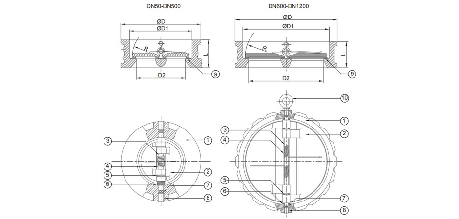 | 编号 | 零件名称 | 材质 | | 1 | 阀体 | 球墨铸铁 | | 2 | 阀板 | CF8,CF8M | | 3 | 阀轴 | SS304,SS316 | | 4 | 弹簧 | SS304,SS316 | | 5 | 轴承 | PTFE | | 6 | 轴承 | PTFE | | 7 | O型密封圈 | 和阀座一样 | | 8 | 六角螺钉 | SS304,SS316 | | 9 | 阀座 | NBR,EPDM,FPM | | 10 | 吊环螺栓 | SS304,SS316 |