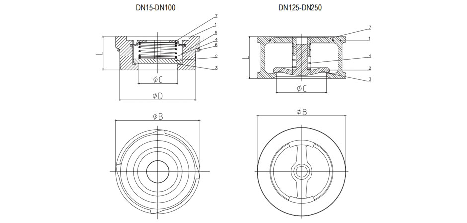 | 尺寸 | B | C | D | L | 重量(kg) | | DN | 英寸 | | 15 | 1/2" | 60 | 15 | 43 | 16 | 0.1 | | 20 | 3/4" | 74 | 20 | 49 | 19 | 0.2 | | 25 | 1" | 85 | 25 | 61 | 22 | 0.3 | | 32 | 1 1/4" | 95 | 32 | 69 | 28 | 0.4 | | 40 | 1 1/2" | 104 | 39 | 78 | 32 | 0.5 | | 50 | 2" | 120 | 48 | 98 | 40 | 1.1 | | 65 | 2 1/2" | 140 | 63 | 115 | 46 | 1.5 | | 80 | 3" | 161 | 76 | 137 | 50 | 2.3 | | 100 | 4" | 186 | 90 | 158 | 60 | 3.5 | | 125 | 5" | - | 112 | 194 | 90 | 5.9 | | 150 | 6" | - | 135 | 220 | 106 | 8.3 | | 200 | 8" | - | 180 | 275 | 140 | 15.4 |