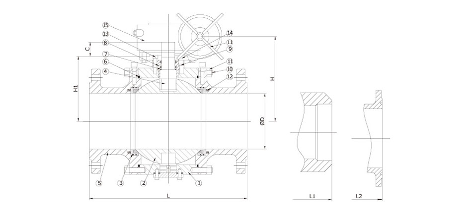 | 编号 | 零件名称 | 材质 | | 1 | 阀体 | A105 | F316 | LF2 | | 2 | 阀球 | F304 | F316 | F304 | | 3 | 阀座 | PTFE, RPTFE, PEEK, 金属阀座 | | 4 | 阀轴 | SS304 | SS316 | SS304 | | 5 | 阀盖 | A105 | F316 | LF2 | | 6 | 阀盖垫圈 | 石墨+316 | | 7 | 填料组件 | RPTFE, 石墨 | | 8 | 密封压盖 | SS316 | | 9 | 密封螺栓 | A193 B7 | A193 B8 | A193 B7 | | 10 | 阀盖螺栓 | A193 B7 | A193 B8 | A320 L7 | | 11 | 阀盖螺母 | A194 2H | A194 8 | A194 4 | | 12 | 阀座弹簧 | SS304 | 铬镍铁合金 X-750 | SS304 | | 13 | 顶部法兰螺栓 | A193 B7 | A193 B8 | A193 B7 | | 14 | 顶部法兰 | A105 | F316 | LF2 | | 15 | 齿轮箱 | 碳钢外壳 |