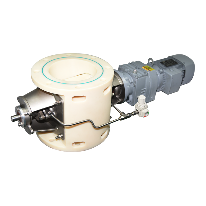 锂电专用星型卸料阀 ★★★★★ 概述 ABC Y2锂电专用星型卸料阀设计用于重力、气力和真空分料,适用于计量大范围的干固体、粒状、粉状物料,在筒仓、料斗、旋风分离器、混合器、称重器等 的出口承担重要作用。 ABC Y2 锂电专用星型卸料阀阀体阀芯采用高强度高耐磨尼龙或聚氨酯,或者采用不锈钢阀体内衬陶瓷等,在锂电材料生产中用以隔绝金属材料跟物料的接触,并且大大增加转子的耐腐蚀性跟耐磨性。 技术参数 ABC Y2锂电专用星型卸料阀采用专利型锥形转子,转子和阀体之间的径向运动间隙调整简单,可根据产品需要进行设置计量。例如在气力输送系统中,可以将通过阀门的压力损失降到最低,当计量产品处于较高或较低温度时,间隙可以现场设置补偿,日常维护简单。阀体与转子支架之间的密封可靠,转子轴与轴孔之间采用动态密封,密封力根据内压自行变化,在确保密封的同时防止转子过于抱紧,从而大幅度延长了阀门的寿命。