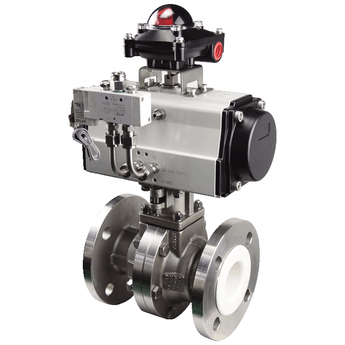 一.基本信息 B55F 系列聚四氟乙烯内衬球阀其阀体和球阀由 PFA、FEP 或 PTFE 全封装,适用于顶级腐蚀介质,具有高可靠性和安全性。 二.特点 1.可更换的 PTFE 阀座 2.机加工到阀体上的燕尾槽确保了衬板与阀体的锁定,并减少了衬板在法兰处的载荷影响 3.金属与金属本体连接确保衬里不会因压力或热循环而被挤出 4.一片式球杆设计,用于调节和关闭(B55F1),两片式球杆设计,压力高达25bar(B55F2)5.通过永久弹簧加载的v形环的自调节填料提供了阀杆密封的完整性,同时保持了较低的转动扭矩6.全流道的设计使压降最小