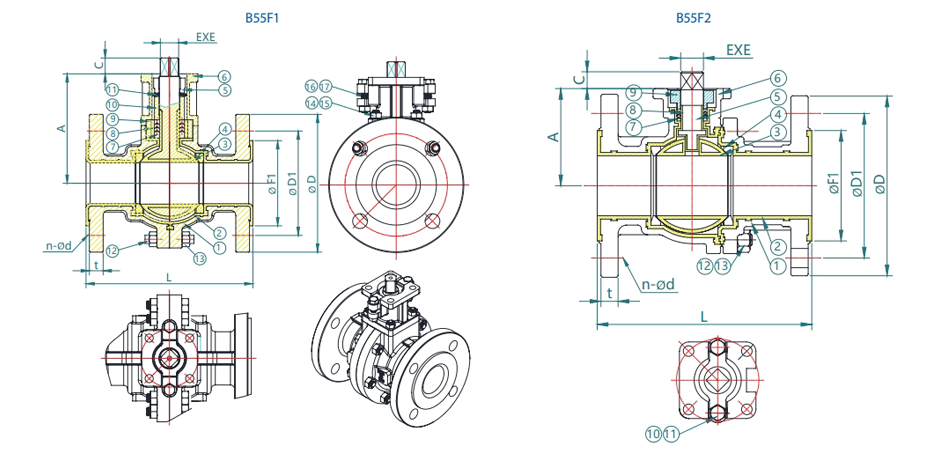 | B55F1 零件清单和材料规格 | B55F2 零件清单和材料规格 | | No. | 零件名称 | 材质 | No. | 零件名称 | 材质 | | 1 | 阀体 | ASTM A216 WCB, ASTM A351 CF8, ASTM A351 CF8M | 1 | 阀体 | ASTM A216 WCB, ASTM A351 CF8, ASTM A351 CF8M | | 2 | 内衬 | FEP,PFA,PTFE | 2 | 内衬 | FEP,PFA,PTFE | | 3 | 阀球/阀轴 | WCB/SS304/SS316由FEP/PFA/PTFE完全封装 | 3 | 阀球 | WCB/SS304/SS316由FEP/PFA/PTFE完全封装 | | 4 | 阀座 | PTFE | 4 | 阀座 | PTFE | | 5 | 填料压盖 | ASTM A351 CF8 | 5 | 阀轴 | SS304, SS316 | | 6 | 支架 | ASTM A351 CF8, ASTM A351 CF8M | 6 | 填料压盖 | ASTM A351 CF8 | | 7 | V型密封圈 | PTFE | 7 | V型密封圈 | PTFE | | 8 | 轴套 | PTFE | 8 | 阀轴内衬 | FEP,PFA,PTFE | | 9 | 填料衬套 | SS304, SS316 | 9 | 压盖 | ASTM 351 CF8, ASTM A351 CF8M | | 10 | 压盖环 | SS304, SS316 | 10 | 压盖螺母 | SS304 | | 11 | 碟簧 | SS301 | 11 | 压盖螺栓 | SS304 | | 12 | 阀体螺栓 | SS304 | 12 | 阀体螺母 | SS304 | | 13 | 阀体螺母 | SS304 | 13 | 阀体螺栓 | SS304 | | 14 | 托架螺栓 | SS304 | | | | | 15 | 托架螺母 | SS304 | | | | | 16 | 压盖螺栓 | SS304 | | | | | 17 | 压盖螺母 | SS304 | | | |